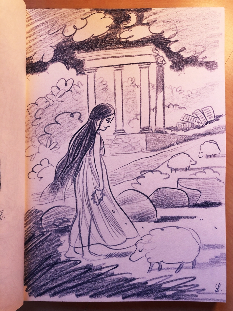 J'aime vraiment beaucoup ce dessin de déesse aux pieds nus avec ses moutons.