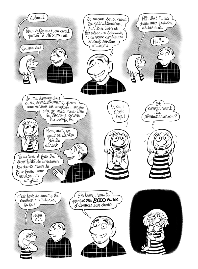En continuant à faire ce que tu aimes et à faire de la bd de qualité, tu finiras pas être dans les best-seller et ensuite des belles avances tu en auras.