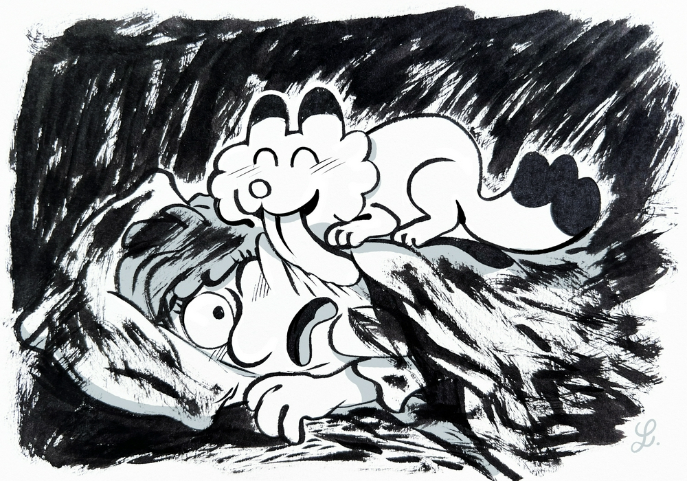 Répondreles petites léchouilles bien rapeuses sur le front en pleine nuit, ça réveille XD