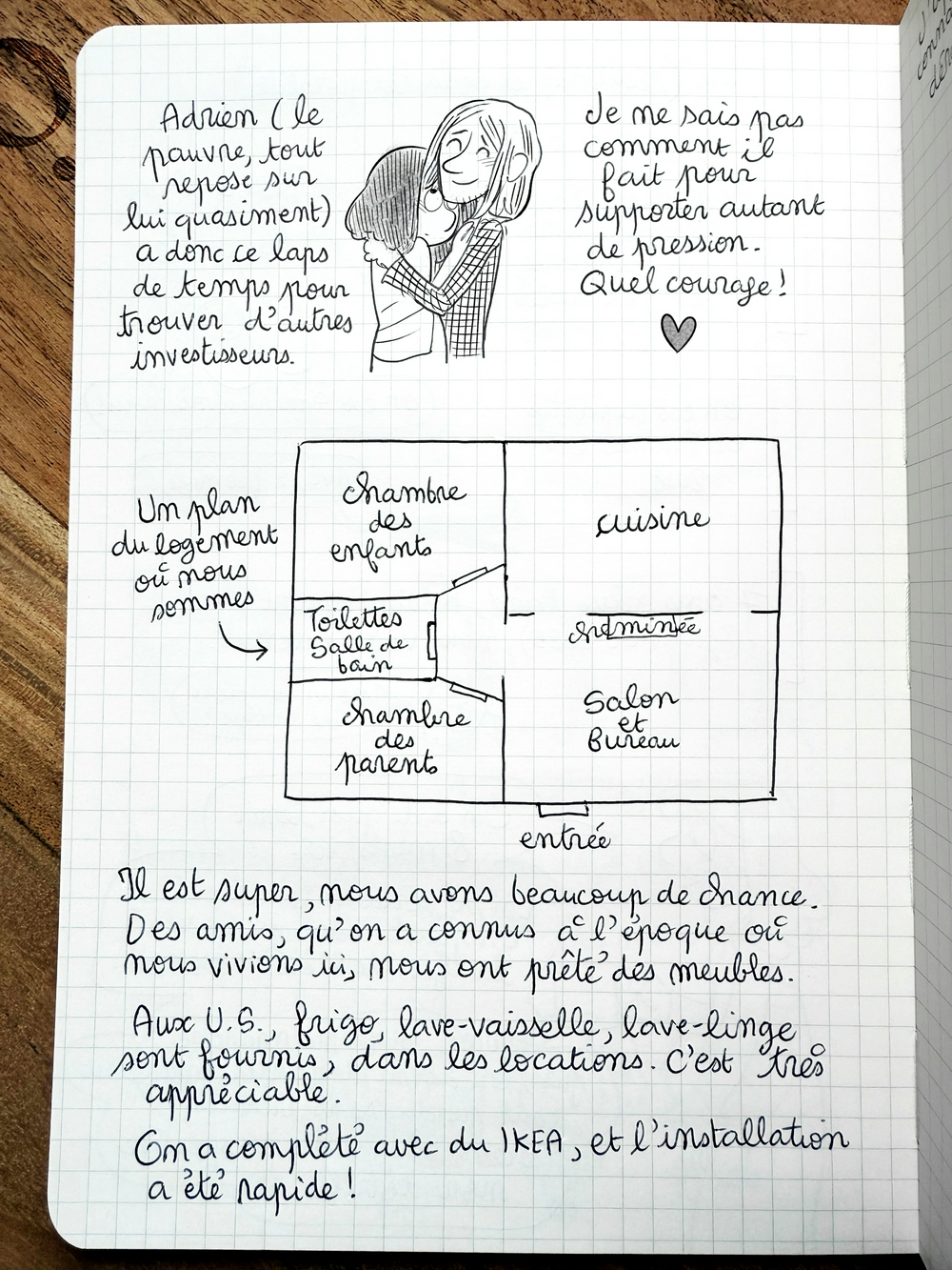 RépondreCes carnets sont excellents. Tes dessins soi-disant « à l’arrache » sont en fait très lisibles et soignés dans leur simplicité. Ce journal apporte énormément de choses : d’abord, il comble un peu les trous dans votre histoire ; il met en lumière l’âme d’entrepreneur d’Adrien, le genre de tempérament auquel on donne peu la parole en France, je trouve ; il permet également de comprendre un peu ta fascination pour les États-Unis. Compte tenu des polémiques qui ont traversé ton lectorat, je trouve cela apaisant.