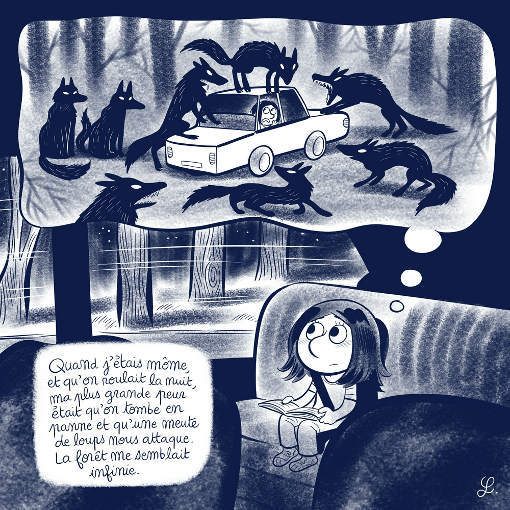 Il n'y avait plus de loups dans nos forêts à l'époque. Ils n'ont commencé à revenir en France que plus tard. Et même aujourd'hui une meute comme celle que tu as dessinée est rare. Mais bon, on ne maîtrise pas ses peurs.
