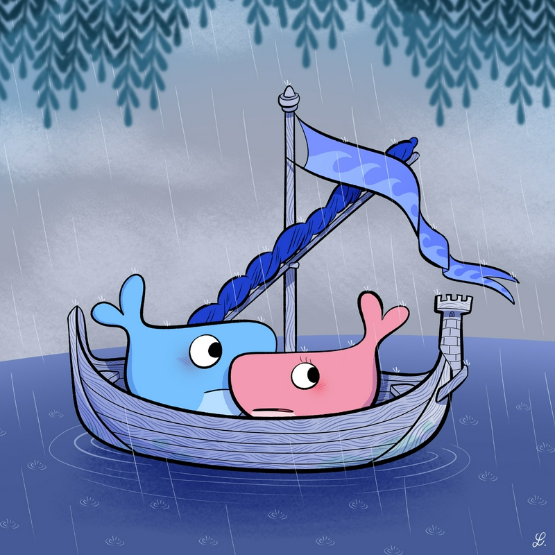 Ben, c'est-à-dire qu'autant sur le humains, il y a cent manières de montrer qu'un personnage est fille ou garçon, autant, sur des baleines, c'est moins évident, donc se réapproprier les clichés de couleurs rose et bleue avec un décalage humoristique (parce que la vraie fille baleine n'est pas rose), c'est sympa, c'est une manière simple de dessiner une baleine masculine et une féminine...