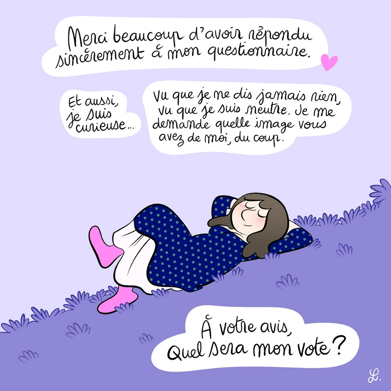 Quant à toi Laurel, si j'en juge (donc forcément un préjugé)par les maigres informations dont je dispose à ton égard, je suppose que tu demeures indécises entre M. Macron (que tu n'apprécieras sans doute pas pour son manque d'implication environnementale) et Mme Hidalgo (et si c'est le cas, tu constitueras une espèce rare en voie de disparition !). Néanmoins, il est possible que mes élucubrations soient très loin de la réalité s'agissant de ton choix personnel.