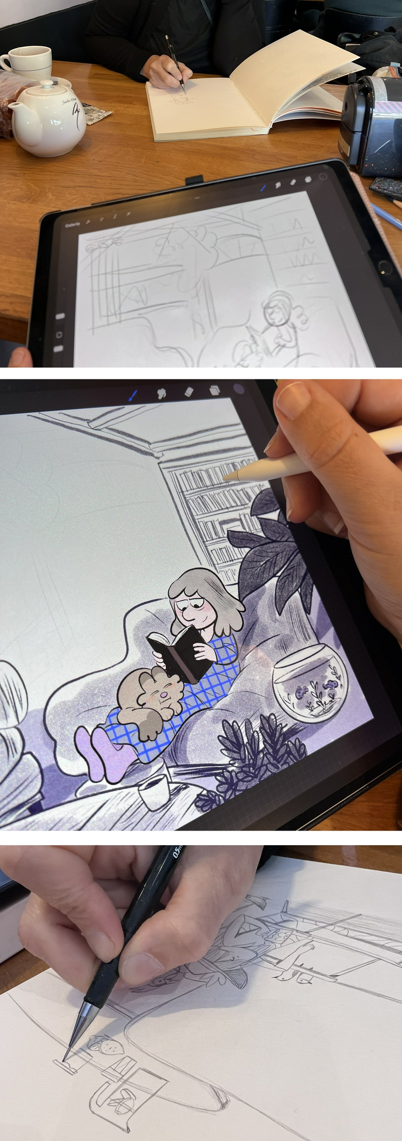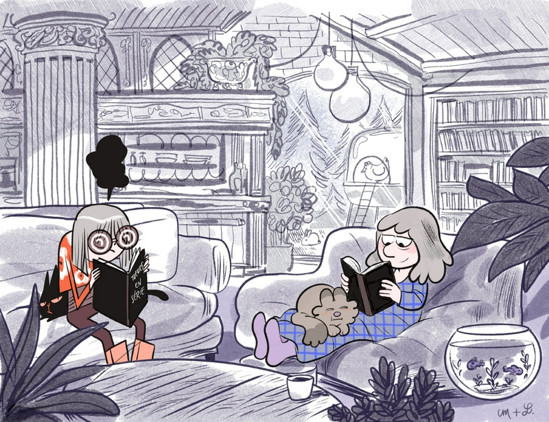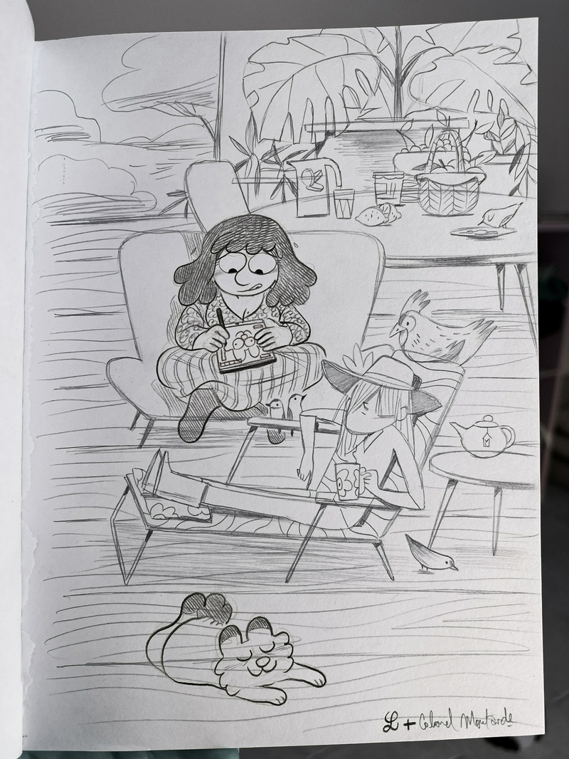Son outil de prédilection : l'iPad (Procreate), et moi plutôt le papier avec les crayons de couleurs Polychromos. Voici le résultat :