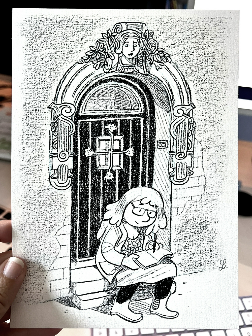 Pas mal. Ceci représente les conditions réelles de mise sur le papier ? (je veux dire que tu dessines cette porte de mémoire, donc assise sur les marches d'escalier et sans tourner ta tête ?)